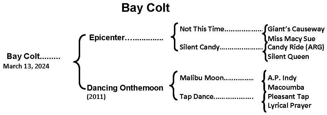 This Bay colt is by Epicenter out of Dancing Onthemoon by Malibu Moon. Epicenter is the black type winner of 6 races in 11 starts, earning $2,9M, champion, Travers S. [G1], Louisiana Derby [G2]-ntr, Jim Dandy S. [G2], Risen Star S. [G2], Gun Runner S., 2nd Kentucky Derby[G1], Preakness S. [G1], Lecomte S. [G3]. His first foals are yearlings of 2025.