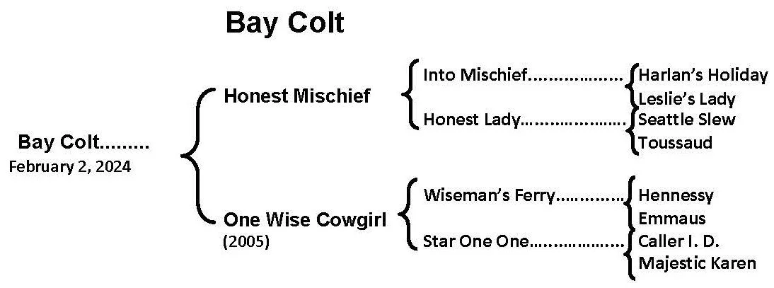This Bay colt is by Honest Mischief out of One Wise Cowgirl by Wiseman’s Ferry. Honest Mischief is the black type winner of 4 races earning $287,464. He is the sire of 18 wnrs, $2,227,105, including Sacrosanct ($505,500, Sleepy Hollow S., etc.), Stone Smuggler (Lady Finger S., etc.), black type-placed Arigatou Gozaimasu [G3], etc.